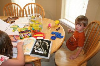 | And this is what Everett does in the morning while Sam and Olivia finish their work. Since he’s only in kindergarten his work doesn’t take more than an hour on most days. Playdoh is good for fine motor skills, right?