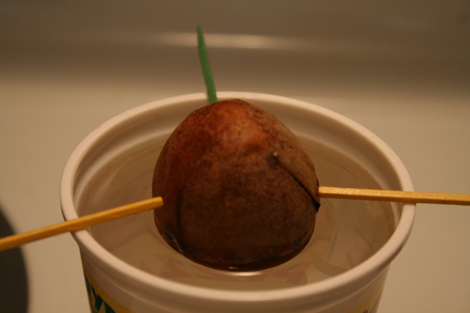 | Here, we’re trying to see if we can get an avocado pit to sprout. If so, we’ll put it into a container, and perhaps it will grow into an avocado tree!