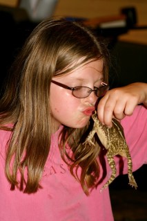 | Pretending to kiss a frog. Hoping for a prince, maybe?