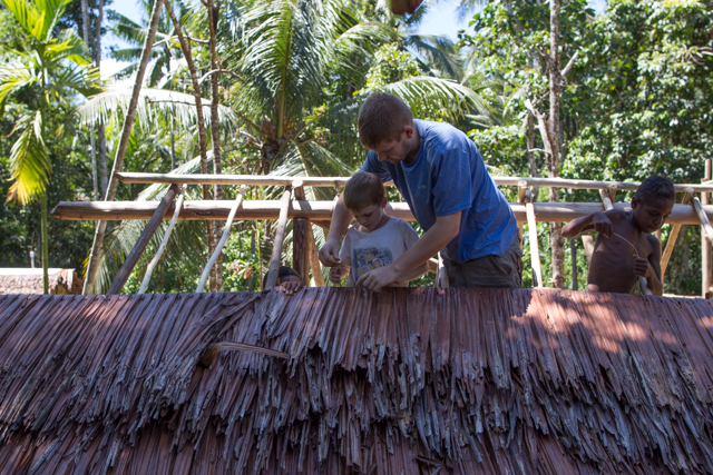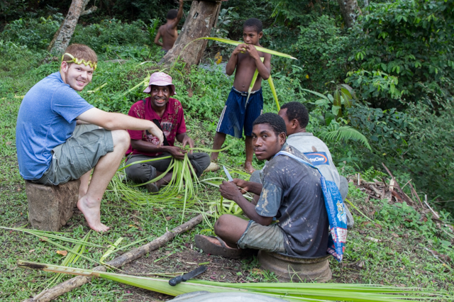 Some of the local teenagers taught Sam how to weave coconut leaves into baskets