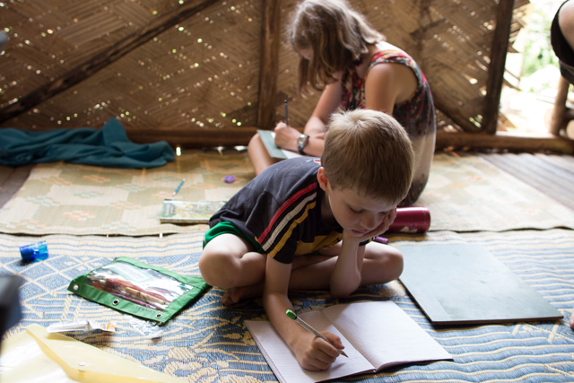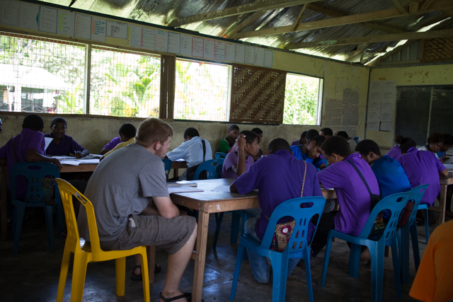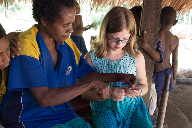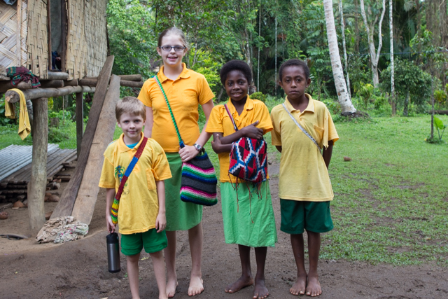 Our was femeli  took great care of us during our time in Bur. They always made sure we had enough food and water, and provided us with plenty of information about PNG culture. Their sixteen year old son, Benjamin, befriended Sam and was such a blessing to him during our time in the village. Sam had the privilege of going to school with Benjamin one day (a “short” one hour walk through the bush), and Sam even spoke to the entire student body during an assembly. This was the first time a waitskin had ever been to their school, so they wanted to know all about him, his life in America, and his plans for the future. Our ten year old was brata (“watch brother”), Klaus, was a great playmate for Everett, and our was susa (“watch sister”), Joy, became a sweet companion for Olivia. One day during our stay in Bur, Everett and Olivia attended the village school, which was only a ten minute walk away, and they both thoroughly enjoyed the day.
