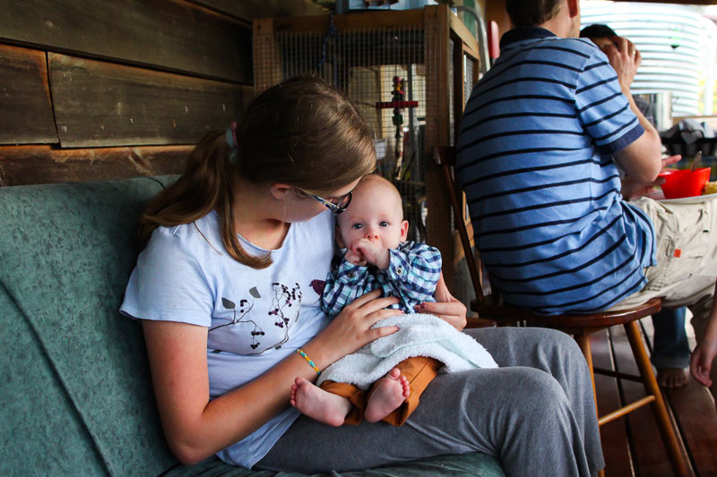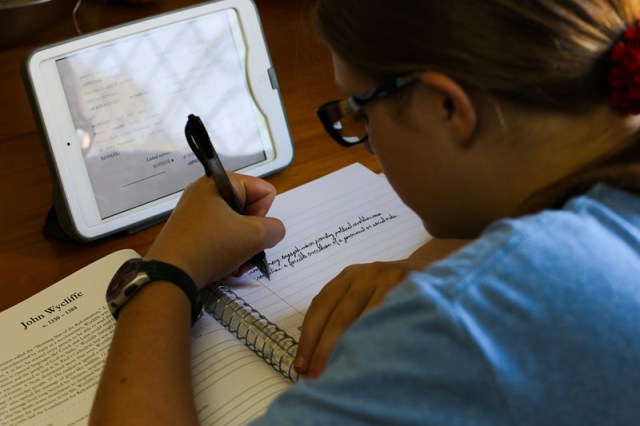 | Olivia still had to keep up with her history studies while we were away from home. Here, she’s writing a paper on John Wycliffe. |