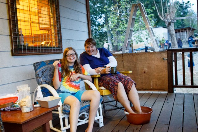 | While the men worked on a building project, Olivia and April treated themselves to pedicures on the front porch. |