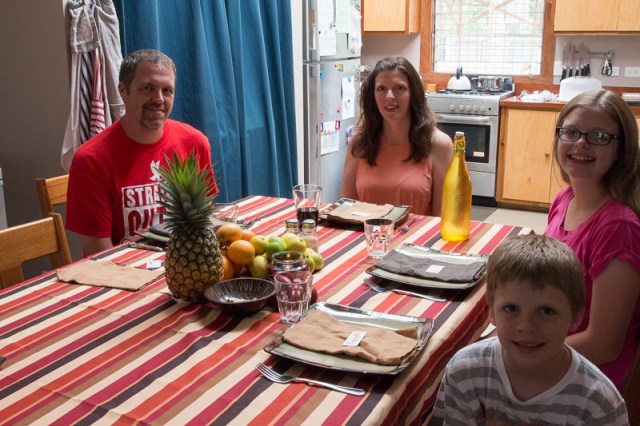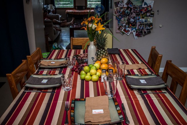 We decorated our table with our abundance. Lemons from a friend, a pineapple from another, flowers from our garden, a candle and autumn leaves from America.